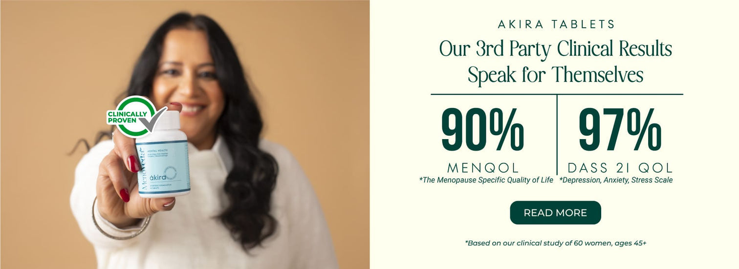 Akira by Menoveda is a precision formula that combines the power of Sarpagandha, Shatavari, Mukta Pishti, Ashwagandha, Jatamansi, Guduchi, Brahmi, Gotu Kola, Shankhpushpi and several other ayurvedic herbs to alleviate menopause symptoms