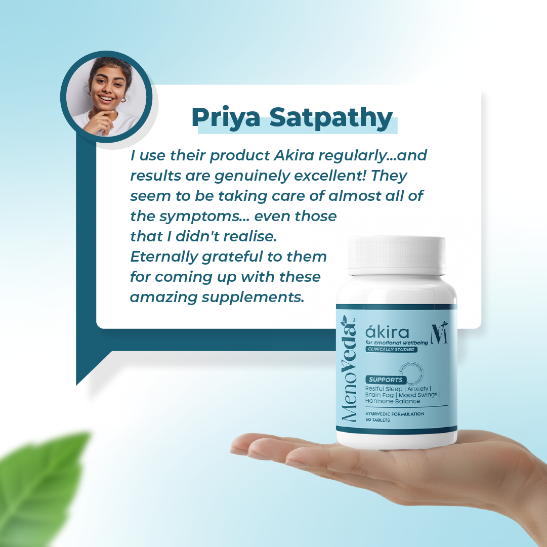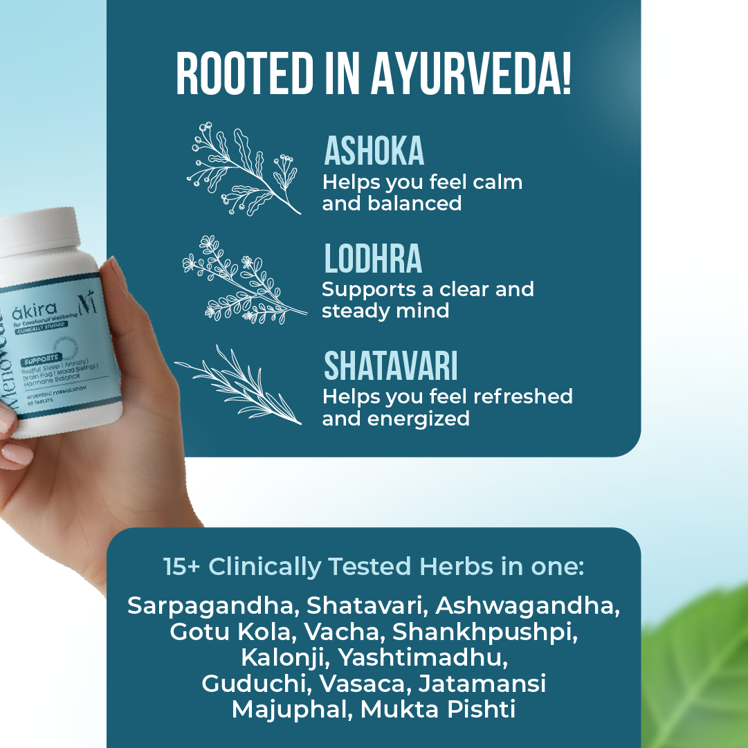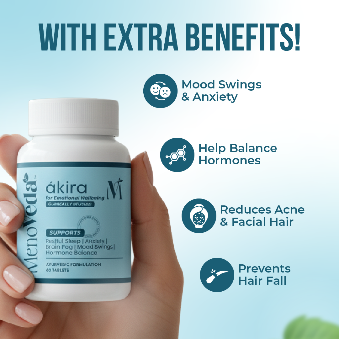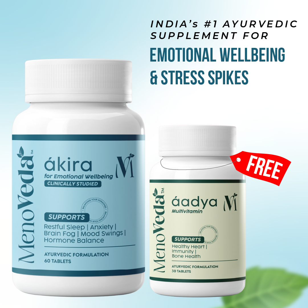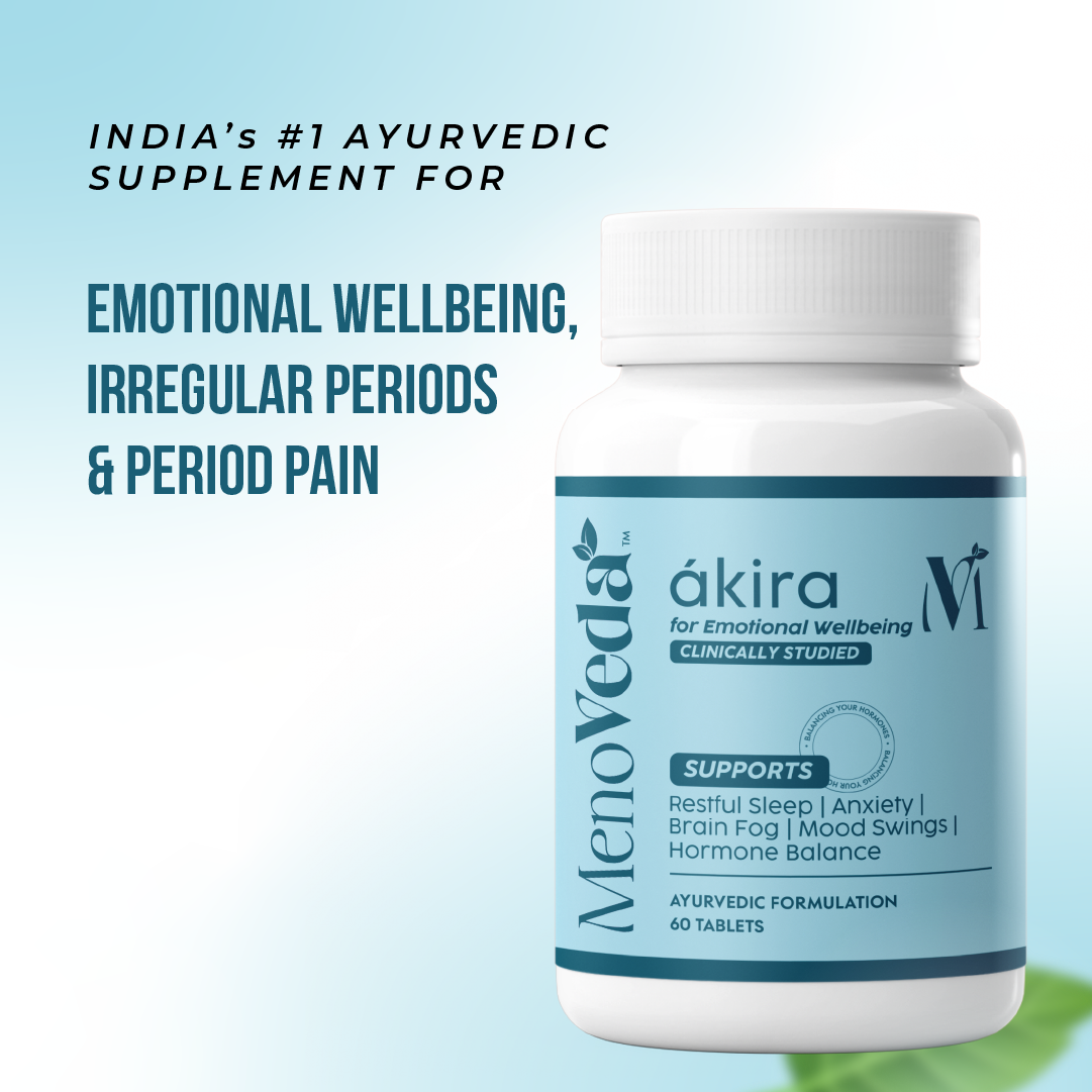 Akira by Menoveda is a doctor-recommended, clinically tested Ayurvedic supplement designed to help women restore hormonal balance, emotional stability, and inner calm — especially during times of Stress , Mood Swings. It Also helps in Increase Your Focus and Supports emotional comfort